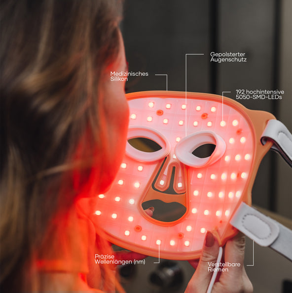 Empfehlung: Tragen Sie die Brille während der Verwendung der LED-Maske für zusätzlichen Augenkomfort und Schutz vor blauem Licht.