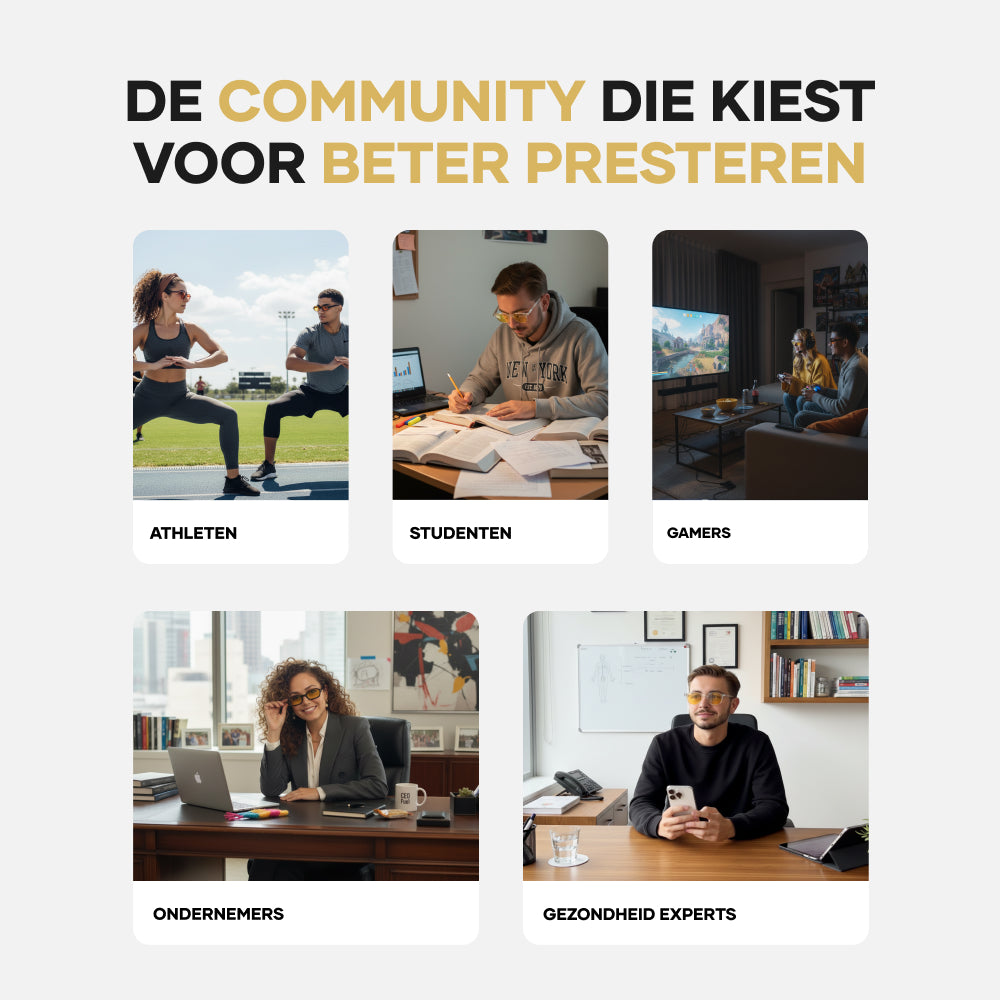 Draag tijdens werk, studie, of bij elk moment van langdurig schermgebruik. Dit ontlast je ogen direct van de druk van blauw licht en helpt je de focus consistent vast te houden.