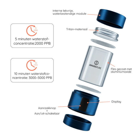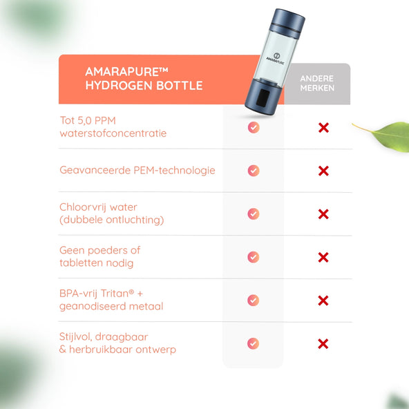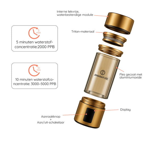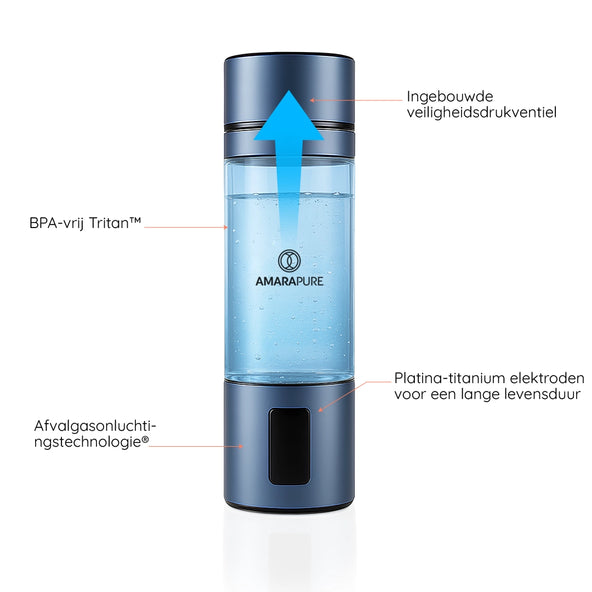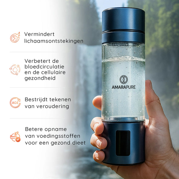 AmaraPure™ verrijkt je water met tot wel negen keer meer therapeutische waterstof via de hydrogenwaterbottle, waardoor gewone hydratatie een krachtige bondgenoot wordt tegen oxidatieve stress en schade door vrije radicalen. Slechts 1 tot 3 flessen per dag kunnen je lichaam een boost geven, waardoor je energiek, ultragehydrateerd en klaar voor alles bent.