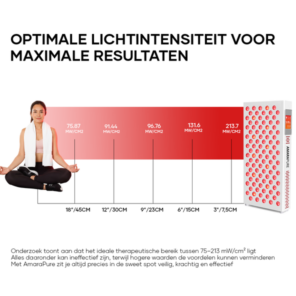 • Afstand & duur: 5–10 minuten per zone als start; bouw op naar 10–20 minuten per gebied. Houd 15–45 cm afstand volgens de handleiding. Start met 3–5 sessies per week.