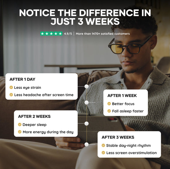 Pour des résultats optimaux et durables, portez les lunettes régulièrement. Une protection quotidienne garantit un biorythme optimal et réduit durablement la fatigue oculaire numérique.