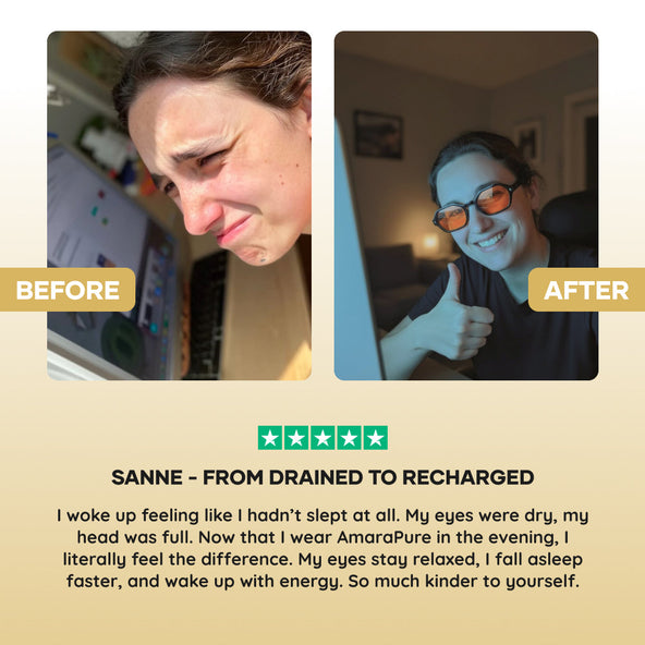 Détendez-vous et endormez-vous plus rapidement après une longue journée. Les écrans émettent de la lumière bleue, qui inhibe la production de mélatonine, l'hormone du sommeil. Portez vos lunettes Amarapure le soir (1 à 2 heures avant le coucher) pour :